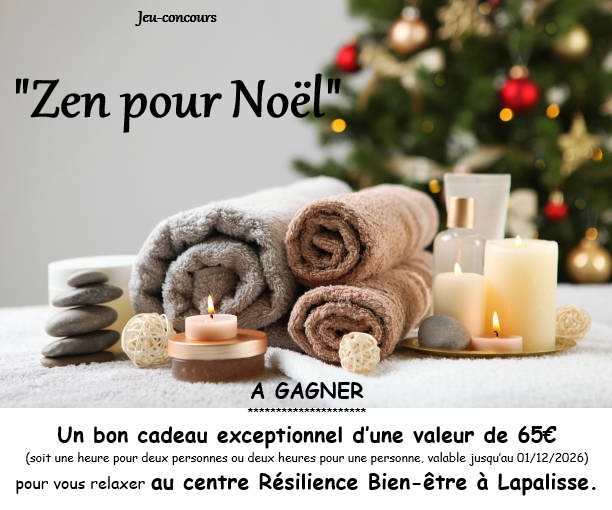Le gagnant se verra offrir un bon cadeau d’une valeur de 65€ (soit une heure pour deux personnes ou deux heures pour une personne) valable jusqu’au 1er décembre 2026 pour vous relaxer au centre Résilience Bien-être à Lapalisse.